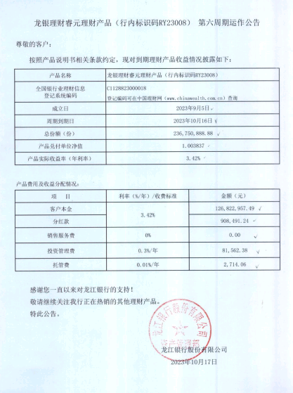 龙银理财睿元理财产品(行内标识码RY23008)第六周期运作公告