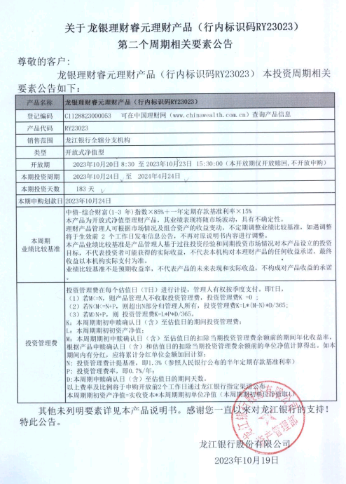龙银理财睿元理财产品(行内标识码RY23023)第二个周期相关要素公告