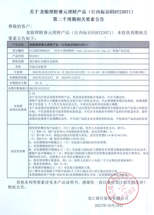 龙银理财睿元理财产品(行内标识码RY23071)第二个周期相关要素公告