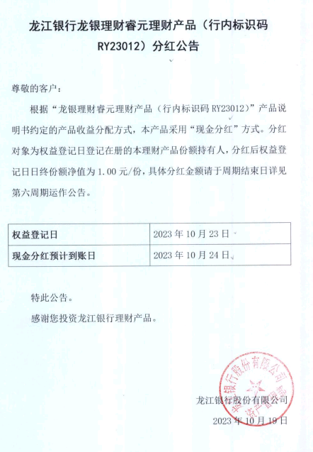 龙江银行龙银理财睿元理财产品(行内标识码RY23012)分红公告