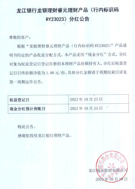 龙江银行龙银理财睿元理财产品(行内标识码RY23023)分红公告