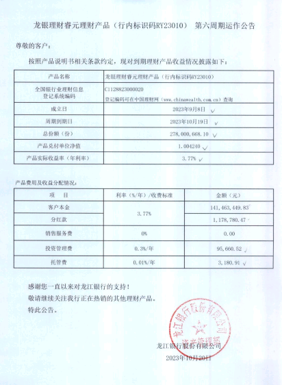 龙银理财睿元理财产品(行内标识码RY23010)第六周期运作公告