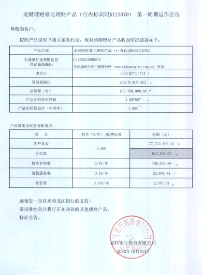 龙银理财睿元理财产品(行内标识码RY23070)第一周期运作公告