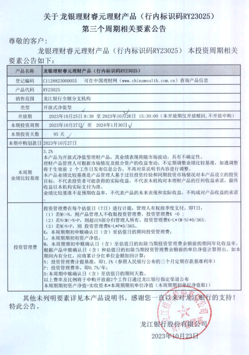 龙银理财睿元理财产品(行内标识码RY23025)第三个周期相关要素公告