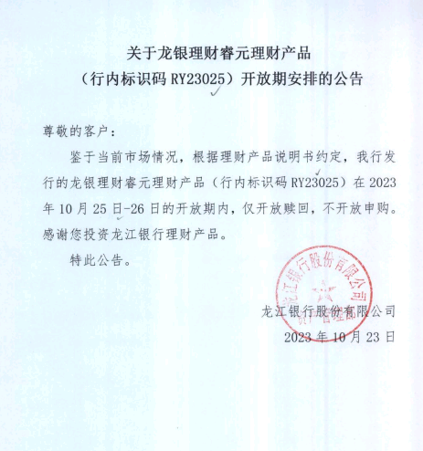 龙银理财睿元理财产品(行内标识码RY23025)开放期安排的公告