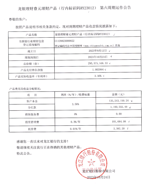 龙银理财睿元理财产品(行内标识码RY23012)第六周期运作公告