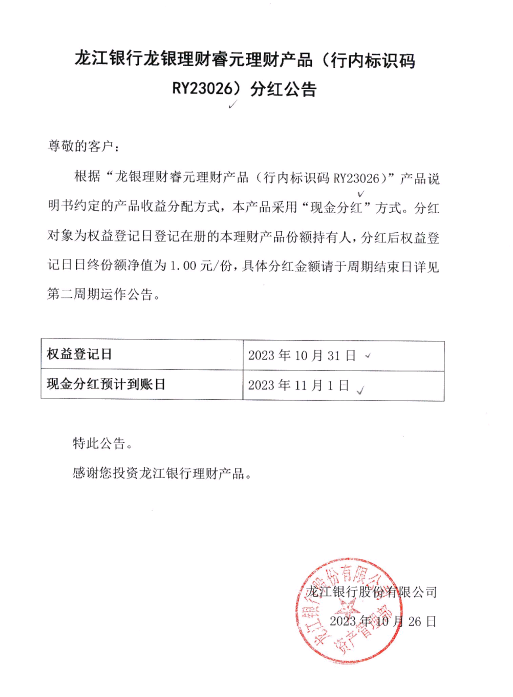 关于龙银理财睿元理财产品(行内标识码RY23026)分红公告