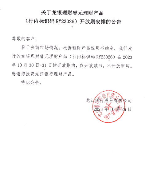 关于龙银理财睿元理财产品(行内标识码RY23026)开放期安排的公告