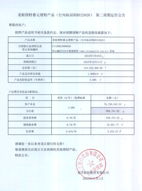 龙银理财睿元理财产品(行内标识码RY23026)第二周期运作公告