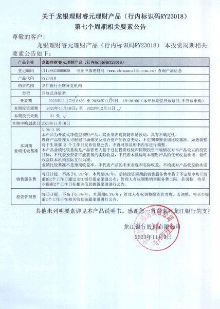 龙银理财睿元理财产品(行内标识码RY23018)第七个周期相关要素公告