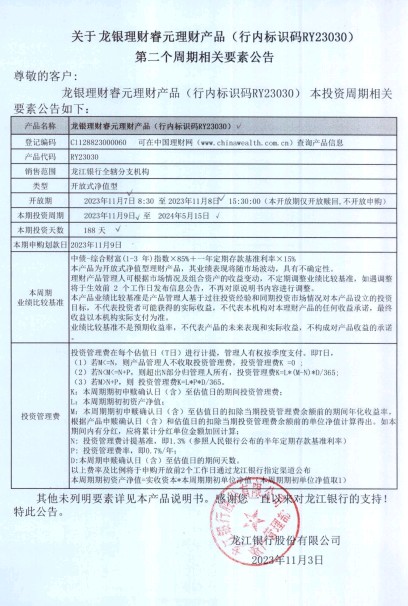 龙银理财睿元理财产品(行内标识码RY23030)第二个周期相关要素公告