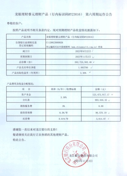 龙银理财睿元理财产品(行内标识码RY23016)第六周期运作公告