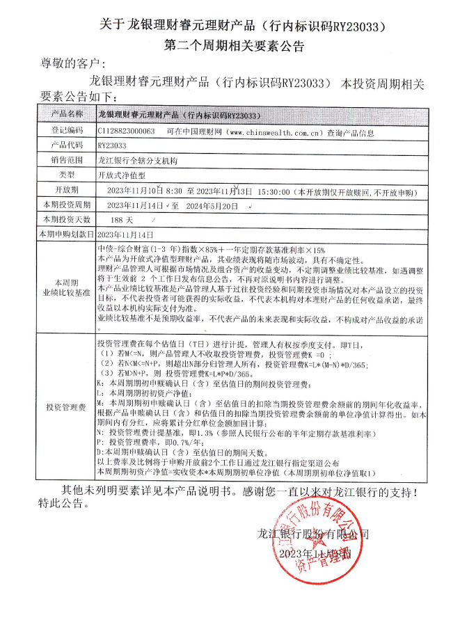 龙银理财睿元理财产品(行内标识码RY23033)第二个周期相关要素公告