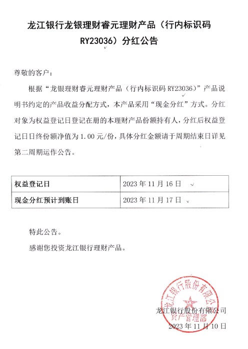 关于龙银理财睿元理财产品(行内标识码RY23036)分红公告