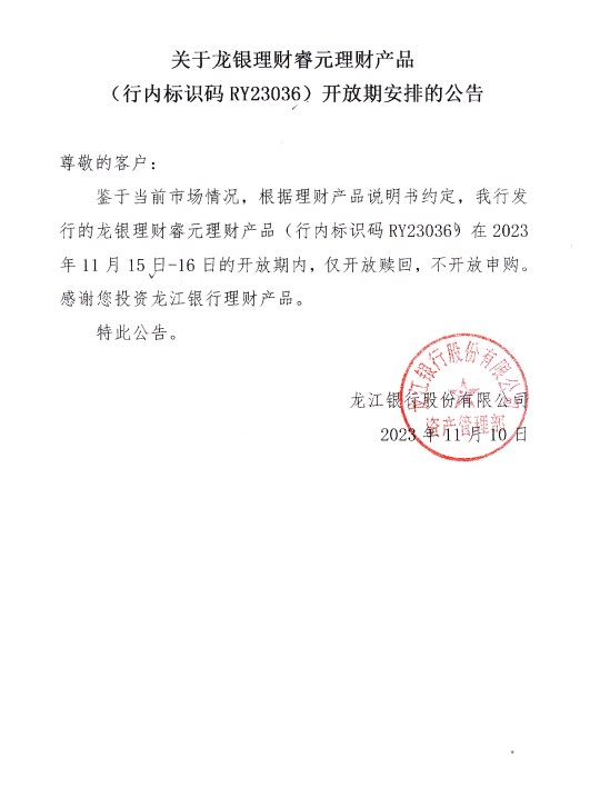 关于龙银理财睿元理财产品(行内标识码RY23036)开放期安排的公告