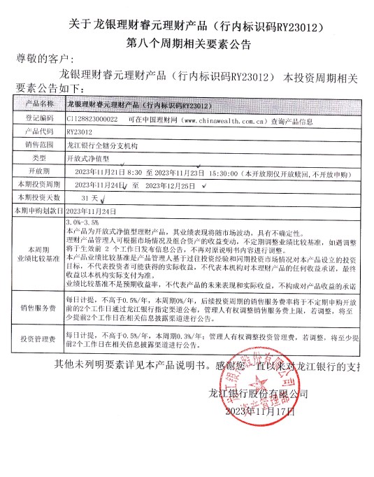 关于龙银理财睿元理财产品(行内标识码RY23012)第八个周期相关要素公告