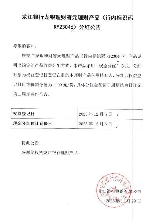 关于龙银理财睿元理财产品(行内标识码RY23046)分红公告