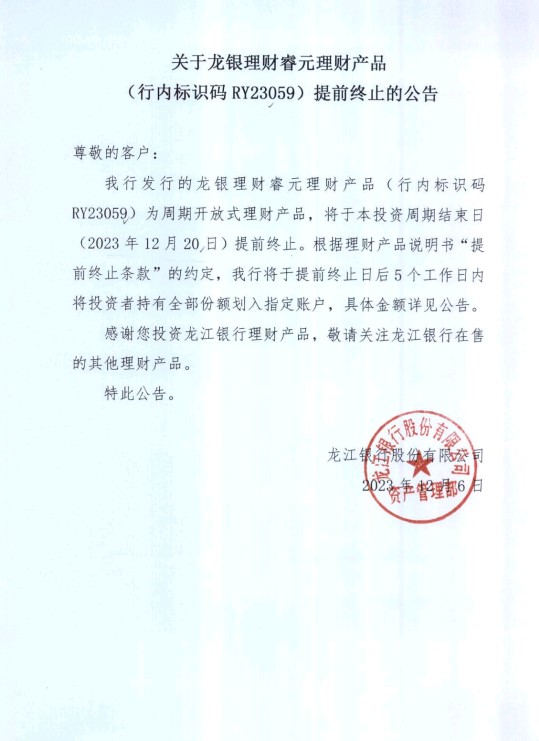 关于龙银理财睿元理财产品(行内标识码RY23059)提前终止的公告