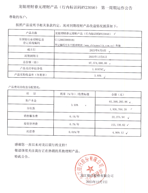龙银理财睿元理财产品(行内标识码RY23050)第一周期运作公告