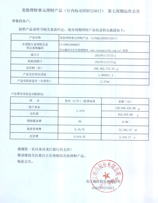 龙银理财睿元理财产品(行内标识码RY23017)第七周期运作公告