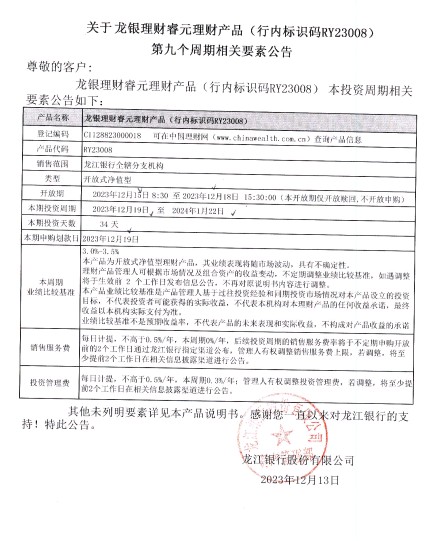龙银理财睿元理财产品(行内标识码RY23008)第九个周期相关要素公告