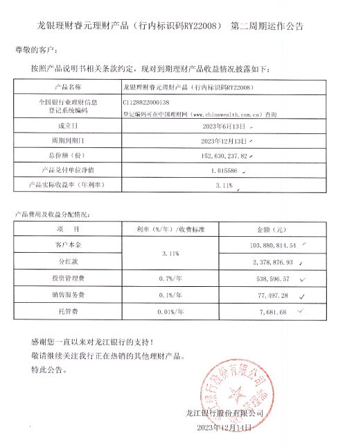 龙银理财睿元理财产品(行内标识码RY22008)第二周期运作公告