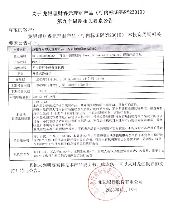 龙银理财睿元理财产品(行内标识码RY23010)第九个周期相关要素公告