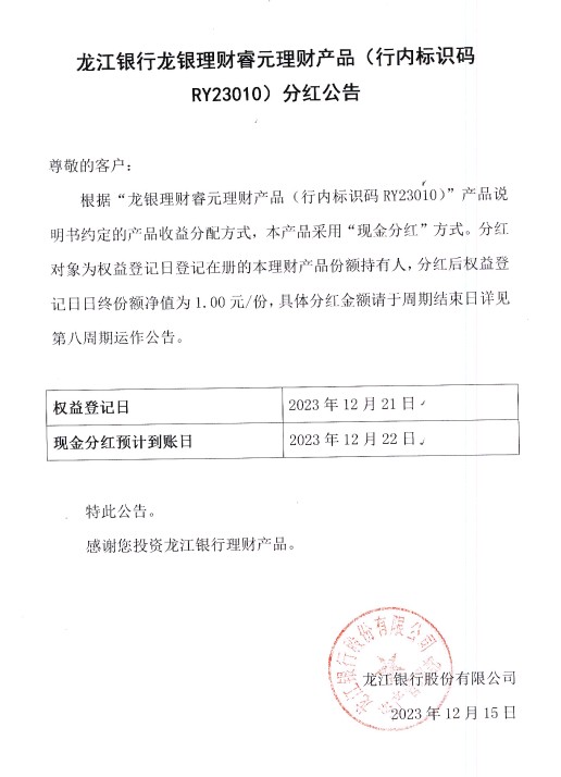 龙银理财睿元理财产品(行内标识码RY23010)分红公告