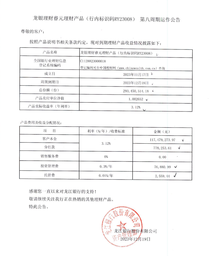 龙银理财睿元理财产品(行内标识码RY23008)第八周期运作公告
