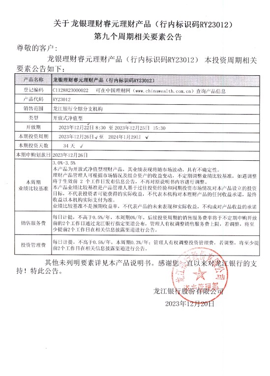龙银理财睿元理财产品(行内标识码RY23012)第九个周期相关要素公告