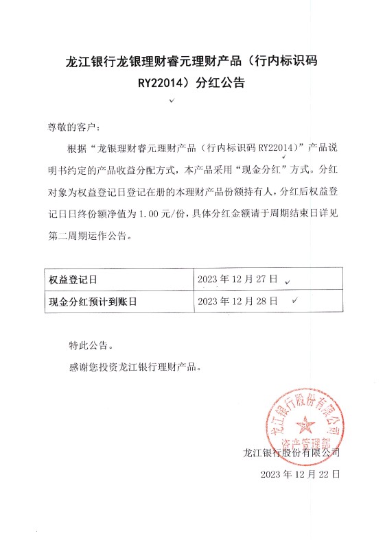 关于龙银理财睿元理财产品(行内标识码RY22014)分红公告