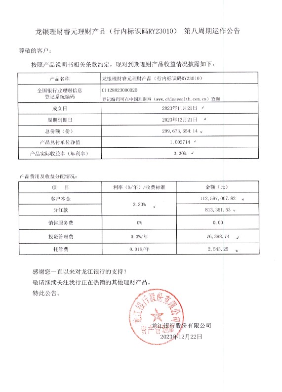 龙银理财睿元理财产品(行内标识码RY23010)第八周期运作公告