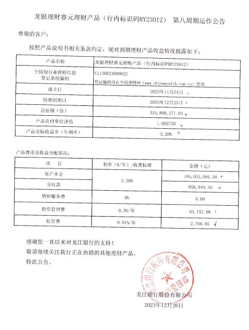 龙银理财睿元理财产品(行内标识码RY23012)第八周期运作公告