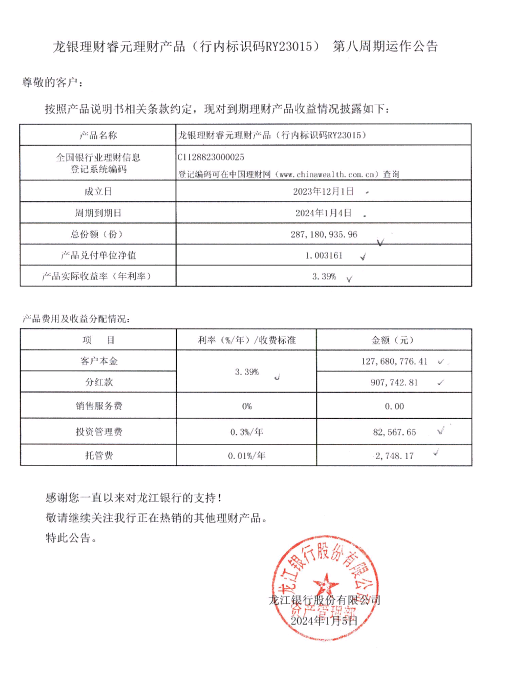 龙银理财睿元理财产品(行内标识码RY23015)第八周期运作公告