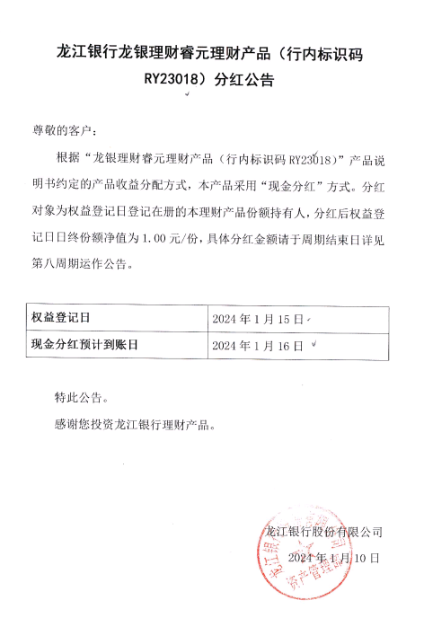 关于龙银理财睿元理财产品(行内标识码RY23018)分红公告