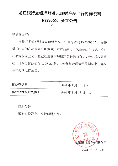 关于龙银理财睿元理财产品(行内标识码RY23066)分红公告