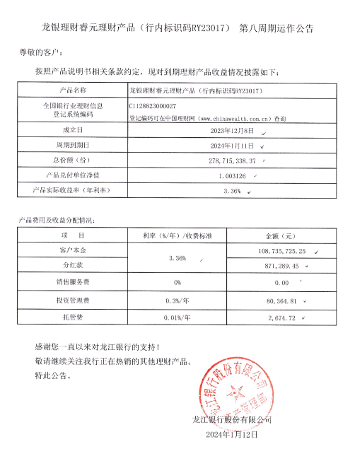 龙银理财睿元理财产品(行内标识码RY23017)第八周期运作公告