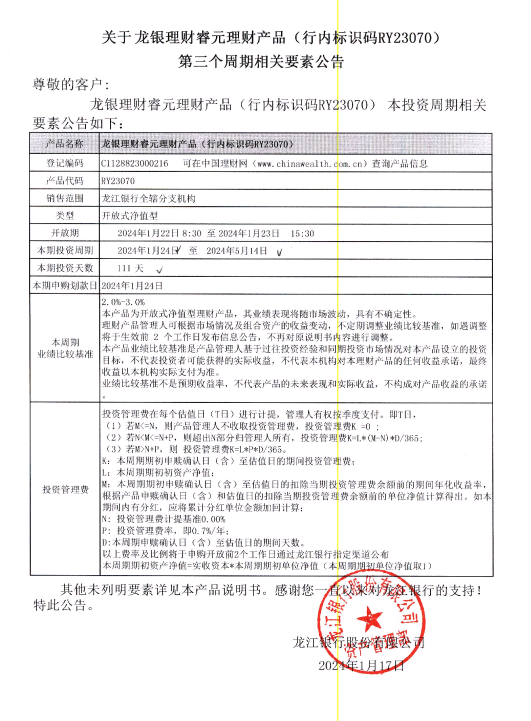 关于龙银理财睿元理财产品(行内标识码RY23070)第三个周期相关要素公告