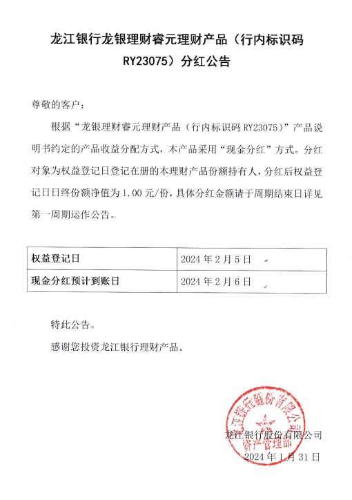 关于龙银理财睿元理财产品(行内标识码RY23075)分红公告