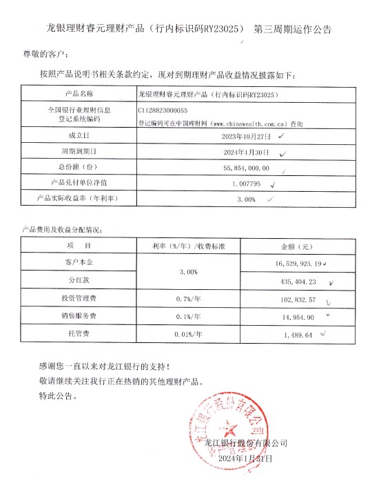 龙银理财睿元理财产品(行内标识码RY23025)第三周期运作公告