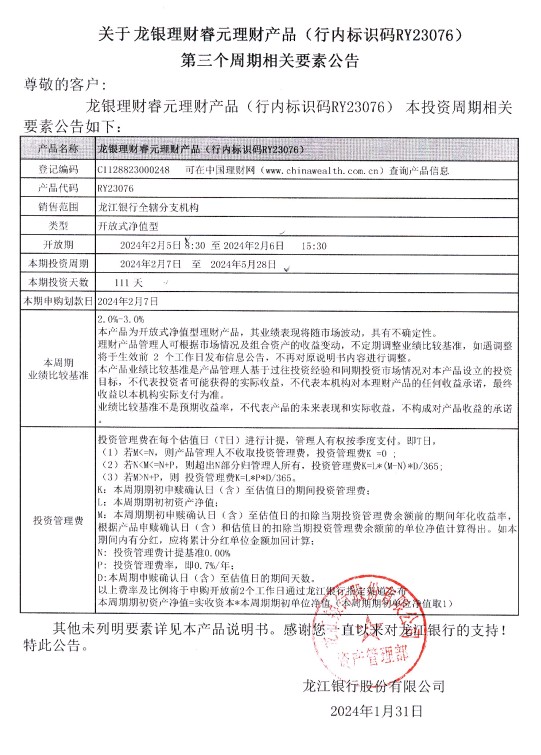 龙银理财睿元理财产品(行内标识码RY23076)第三周期要素公告