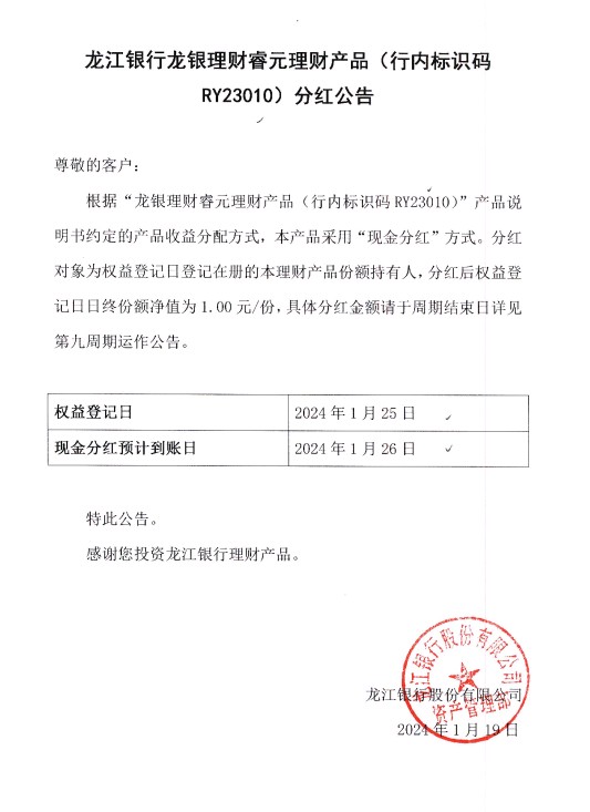 龙银理财睿元理财产品(行内标识码RY23010)分红公告