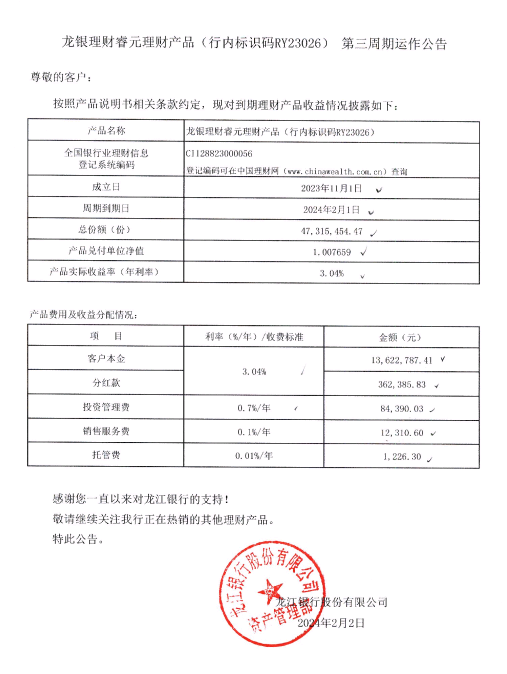 龙银理财睿元理财产品(行内标识码RY23026)第三周期运作公告