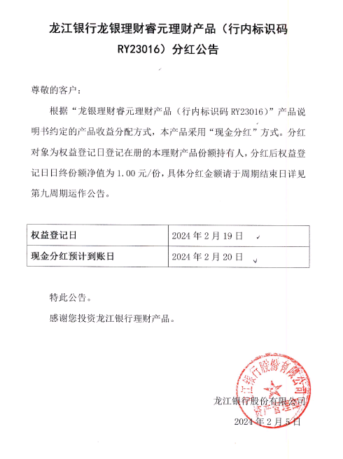 关于龙银理财睿元理财产品(行内标识码RY23016)分红公告