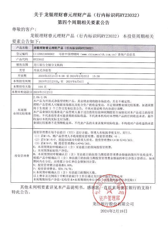 关于龙银理财睿元理财产品(行内标识码RY23032)第四个周期相关要素公告