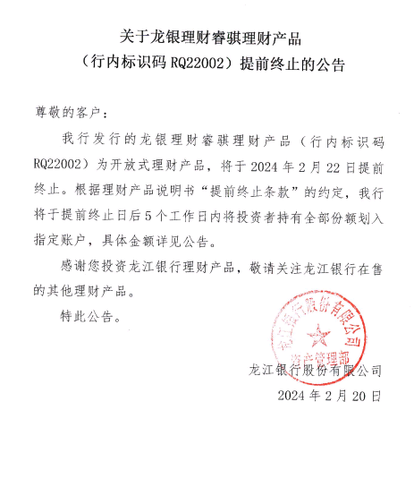 龙银理财睿骐理财产品(行内标识码RQ22002)提前终止的公告