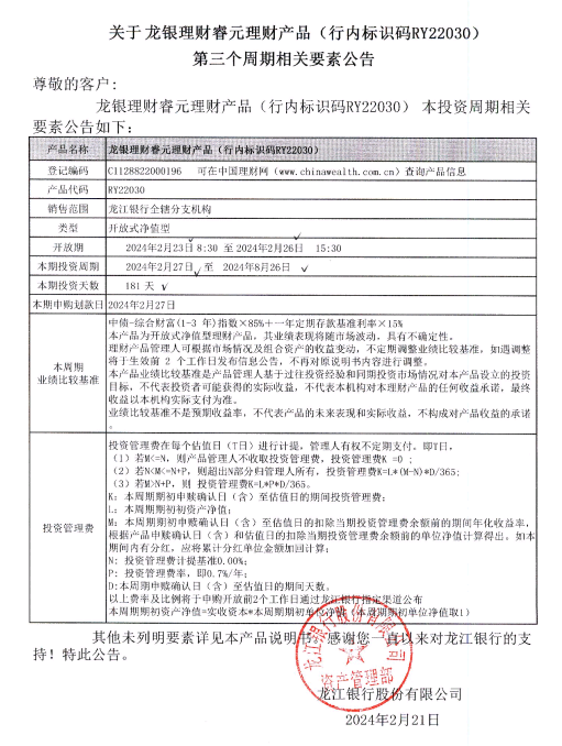 关于龙银理财睿元理财产品(行内标识码RY22030)第三个周期相关要素公告