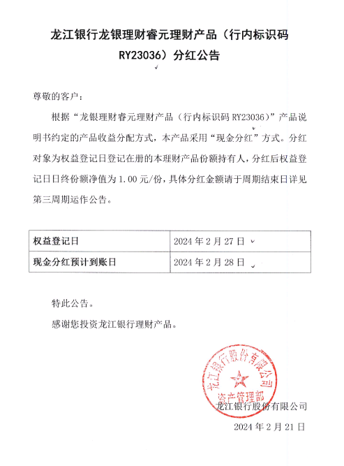 关于龙银理财睿元理财产品(行内标识码RY23036)分红公告