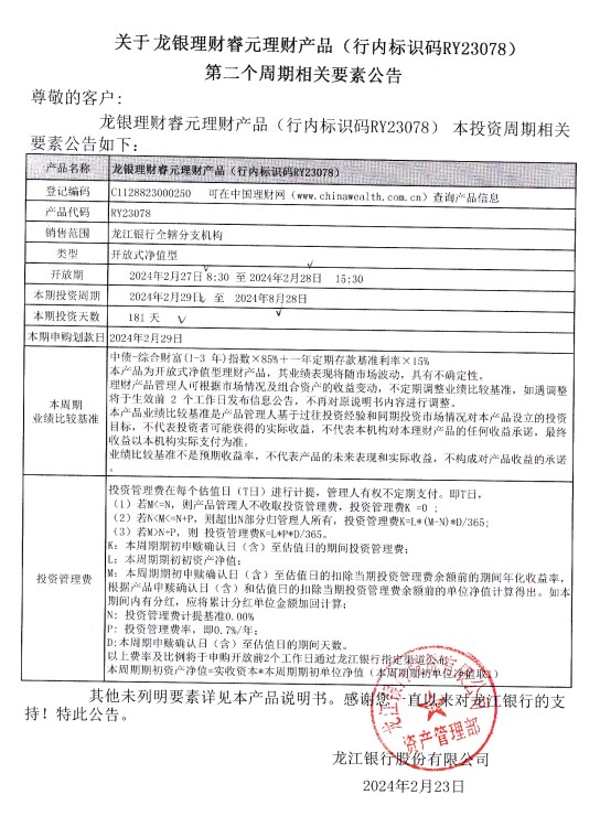 龙银理财睿元理财产品(行内标识码RY23078)第二个周期相关要素公告