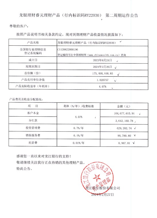 龙银理财睿元理财产品(行内标识码RY22030)第二周期运作公告
